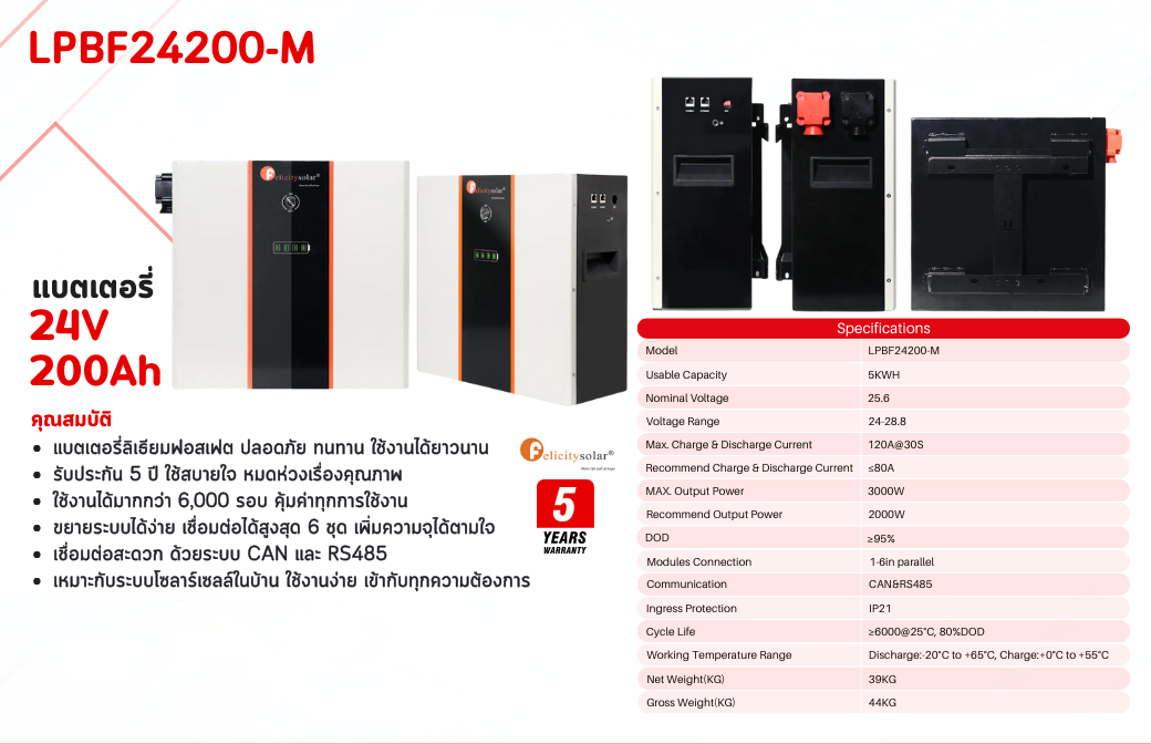 Battery Felicitysolar LPBF24200-M LiFePO4 24V 200Ah แบตเตอรี่โซล่าเซลล์ ชนิดลิเธียมฟอสเฟต